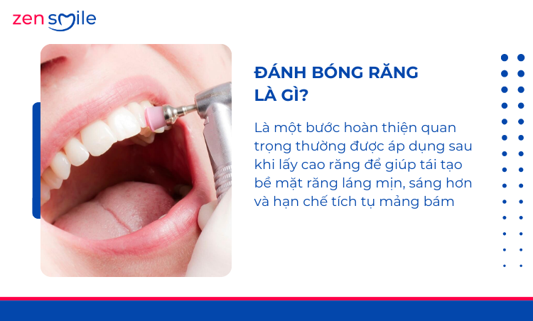 Đánh bóng răng là kỹ thuật sử dụng chổi chuyên dụng, cao su đánh bóng và bột đánh bóng nha khoa để làm nhẵn bề mặt răng sau khi đã được làm sạch mảng bám. Quá trình này giúp loại bỏ các vết ố nhẹ, mảng bám li ti còn sót lại và tạo bề mặt răng trơn láng, khó bám bẩn hơn.