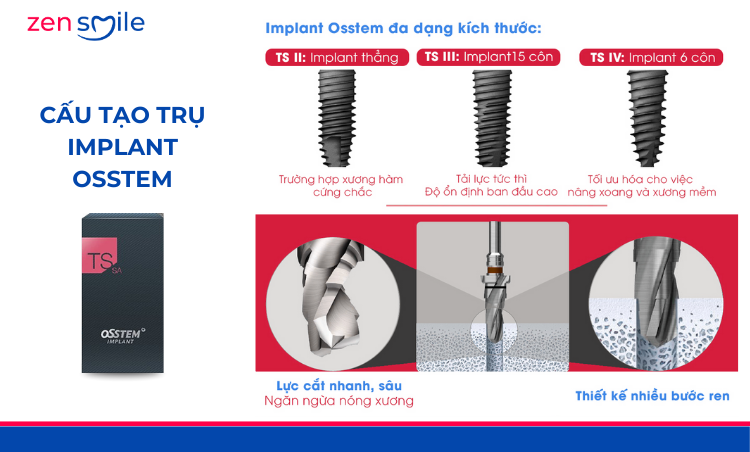Osstem có nhiều kích thước, đường kính và chiều dài trụ, giúp bác sĩ dễ dàng lựa chọn phương án phù hợp cho từng tình trạng xương hàm – kể cả xương tiêu vừa.