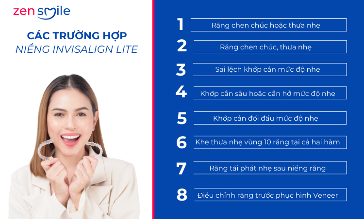 Invisalign Lite Mức 3 là lựa chọn hoàn hảo cho những ai muốn niềng răng nhanh – đẹp – không đau và không ai biết mình đang niềng. Tại Zensmile, hành trình chỉnh nha còn êm ái hơn nhờ triết lý ZenCare Experience, theo dõi sát và cá nhân hoá theo từng khách hàng để đạt kết quả tối ưu nhất.